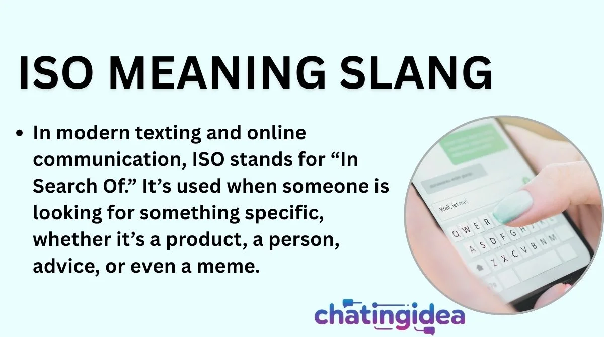 In modern texting and online communication, ISO stands for “In Search Of.” It’s used when someone is looking for something specific, whether it’s a product, a person, advice, or even a meme.